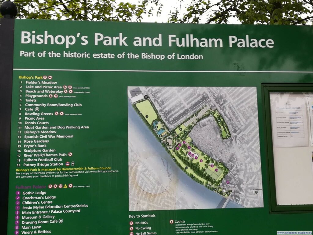Niestety jeszcze zanim wybrałem się na Wyspy wiedziałem, że nie będzie mi dane skorzystać z wycieczki stadionowej typu tour stadium. W tym okresie były rozgrywane mecze i obiekt był wyłączony ze zwiedzania. Jest to jeden z najstarszych stadionów piłkarskich w Londynie. Jego początki datuje się na 1896 rok!!! A jego nazwa wzięła się od nazwy rezydencji gdzie kiedyś przebywały koronowane głowy. Położony jest nad samą Tamizą w dzielnicy Fulham. Dzielnicy pełnej domów czynszowych i szeregowych. Jedna z trybun stadionu przylega do samej rzeki. Jest to jeden z niewielu stadionów w mieście gdzie trzeba się dużo nachodzić od najbliższego środka komunikacji. Najlepiej i najszybciej dostać się tam oczywiście metrem (w Londynie jest aż 11 linii). Z centrum dojedziemy linią District do stacji Putney Bridge i dalej ok. 20 minut spacerem na stadion. Po drodze miniemy piękny park z kościołem episkopalnym i placami zabaw.