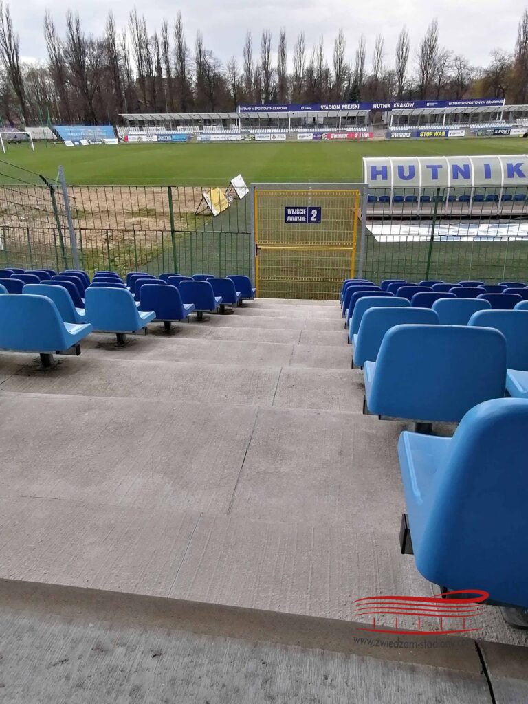 Pierwsze kroki skierowałem do Nowej Huty. To dzielnica a pierwotnie miasto zbudowane w 1949 roku dla pracowników mającego powstać kombinatu metalurgicznego. Od 1951 roku jest oficjalnie jedną z dzielnic Krakowa. Charakteryzuje się ona specyficzną zabudową oraz wieloma mitami związanymi z dzielnicą jak np. to, że jest to najniebezpieczniejsza część miasta. Są tu także obiekty, które warto odwiedzić jak np. Teatr Ludowy czy Aleja Róż. Ja postanowiłem odwiedzić stadion Hutnika Kraków, który mieści się on przy ulicy Ptaszyńskiego 4. Dojedziemy tam komunikacją miejską, tramwajem lub autobusem. Obiekt powstał w 1950 roku. Doczekał się jednego dużego remontu w latach 2009-2010. Pojemność stadionu wynosi 1669 miejsc. Dużo miejsc na łukach trybun jest zasłoniętych przez bandy reklamowe. Na Suchych Stawach, czyli potocznej nazwie tego miejsca na co dzień gra drugoligowy Hutnik. Nazwa pochodzi od dawnych stawów rybnych, które znajdowały się nieopodal.