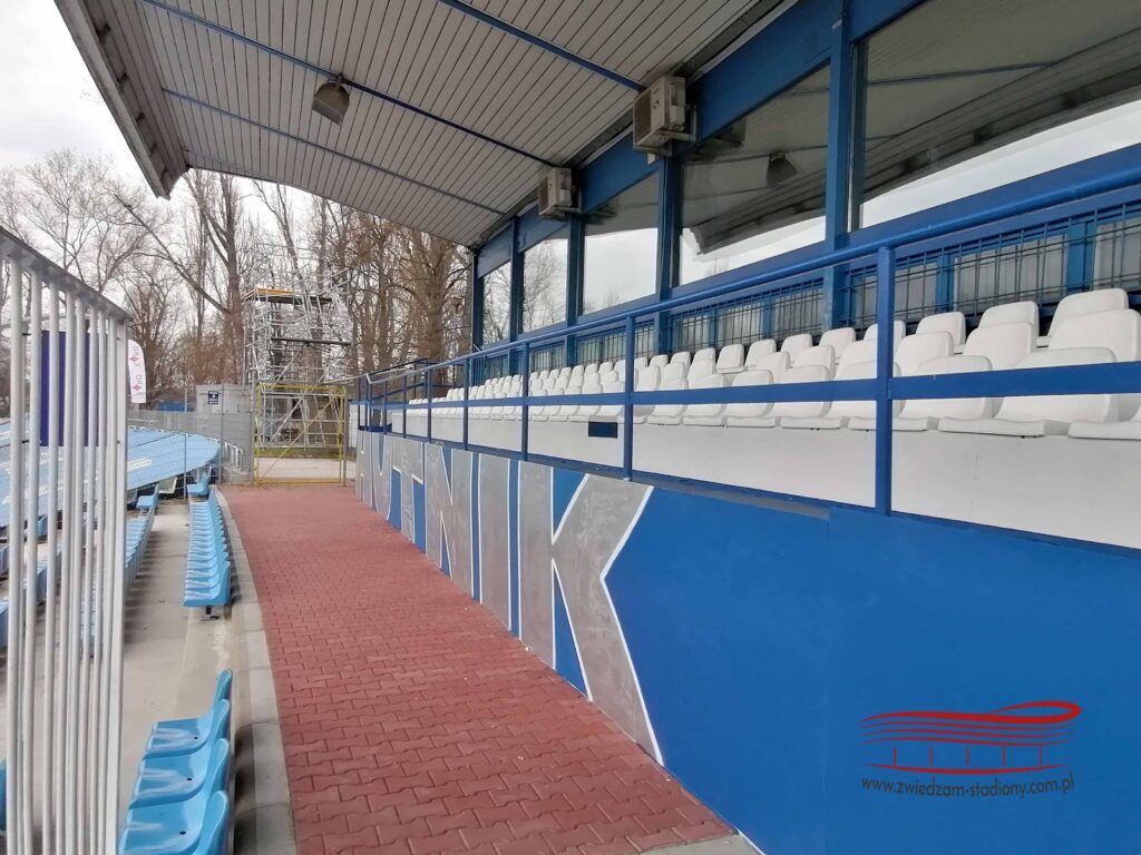 Na trybunie mogą zasiąść dokładnie 963 osoby w tym 50 osób na sektorze gości. Niedawno, by otrzymać licencję na grę w II lidze zamontowano dach nad częścią trybuny. Klub zawarł spółkę z jednym z deweloperów, który wybudował pięć budynków mieszkalnych a klub dzięki udziałom w spółce i późniejszej ich sprzedaży, w 2016 roku mógł wybudować nowy budynek klubowy, pełnowymiarowe boisko ze sztuczną nawierzchnią wraz z oświetleniem, boisko treningowe z naturalną nawierzchnią a także klubowy parking. Obecnie są plany by wybudować kompleks sportowy z obiektem na 4500 miejsc. Część radnych wyraziła zgodę na inwestycję, teraz decyzja leży po stronie prezydenta. Niestety na stadion nie można wejść i porobić zdjęcia. Ja robiłem zza płotu i od strony parkingu. Za trybuną jest tyle drzew i krzaków, że skutecznie przeszkadzają w „podziwianiu” areny.
